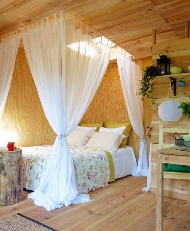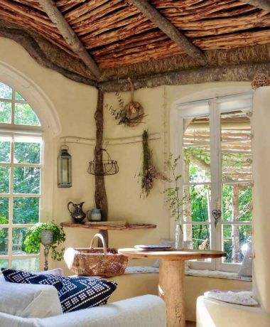 Les matériaux avec lesquels je construis sont choisis pour s’intégrer harmonieusement à leur environnement; ils sont locaux, souvent de ma propre terre : du chêne pour les toits, du robinier pour les fondations et de l’argile pour les enduits terre. Et bien sûr tout est bio, depuis l’huile de lin pour protéger le bois jusqu’aux draps en coton bio sur les lits et les toilettes sèche dans les salles de bains.