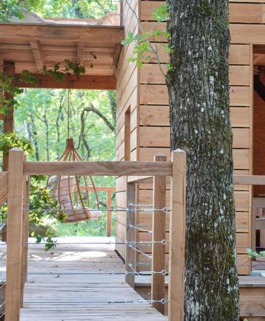 Notre cabane perchée et romantique sur deux étages, nichée dans la cime des chênes. Profitez d'une vue imprenable sur le lac, d'un spa privatif chauffé au feu de bois et de nuits sous les étoiles.