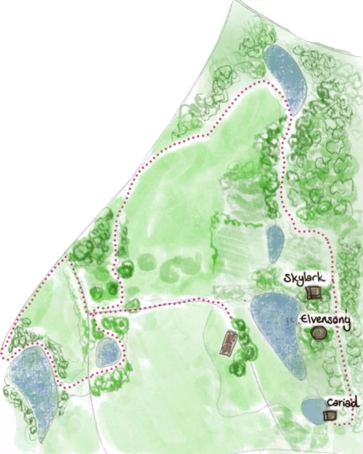 Chaque cabane a un accès privé au sentier que nous avons fait à Terre et Toi. Il vous conduit à travers les bois, les champs et les chênes centenaires pour découvrir nos étangs cachés.